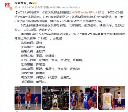 通過體測,共有6支球隊全員通過了體測,其中就包含山東女籃。其他5支球隊則是北京女籃、武漢女籃、陜西女籃、江蘇女籃和遼寧女籃。