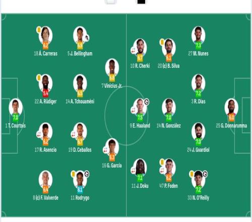 曼城首發:25-多納魯馬、27-努內斯、3-迪亞斯、24-格瓦迪奧爾、33-奧賴利、14-尼科·岡薩雷斯、20-B席、47-福登、10-謝爾基、11-多庫、9-哈蘭德。