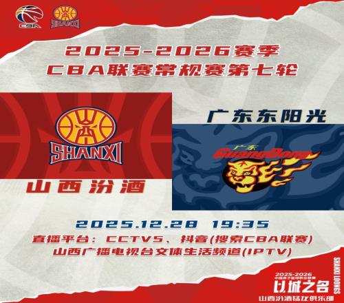 北京時間2025年12月28日19:35,2025-2026賽季CBA聯賽常規賽第七輪繼續進行,山西汾酒坐鎮主場,迎戰廣東東陽光,球迷觀眾可以通過CCTV5、央視頻、抖音(搜索CBA聯賽)、山西廣播電視臺文體生活頻道(IPTV)觀看比賽實況,敬請期待!
