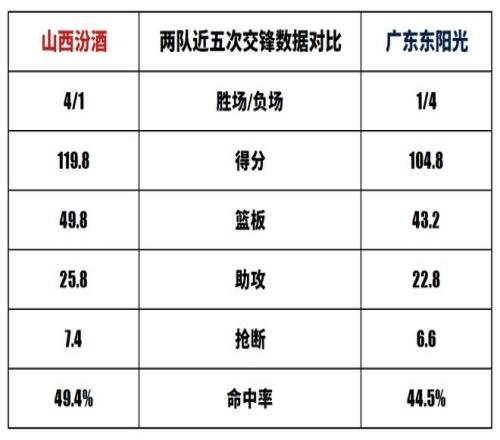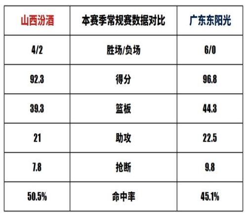 山西汾酒與廣東東陽光歷史上一共交手48次,山西汾酒10勝38負。上賽季兩隊交手7次,山西汾酒6勝1負。