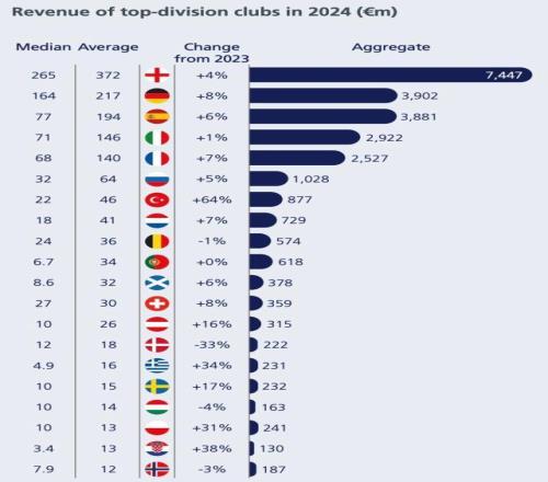 收入排名前20的聯賽中,有16個聯賽在2024年實現了收入增長。英格蘭俱樂部繼續創造最多的收入,盡管其收入占比從27%下降到26%。德國俱樂部的收入中位數是西班牙、意大利或法國俱樂部的兩倍多。