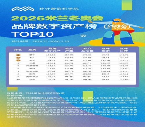 答案早已寫在數(shù)據(jù)里:蒙牛,以絕對(duì)優(yōu)勢(shì)霸榜秒針《2026米蘭冬奧品牌數(shù)字資產(chǎn)榜》,成為唯一在社交聲量、互動(dòng)量、口碑三個(gè)維度全面領(lǐng)跑的品牌。