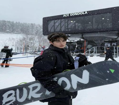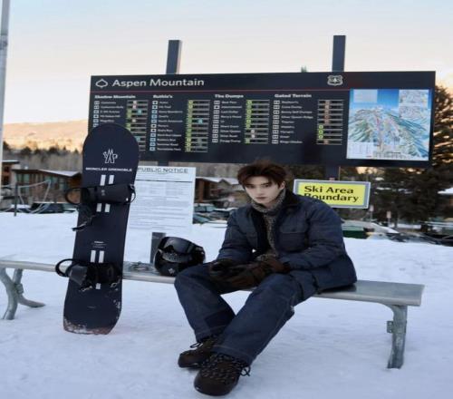 張樂康身著牛仔雪服,內(nèi)搭針織毛衣,隨性又不失質(zhì)感。同色系棕色雪靴與手套相互呼應(yīng),將冬日運動穿搭的舒適與格調(diào)完美融合。