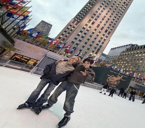 樸元彬與好友同行,簡約黑色外套內(nèi)搭中式盤扣上衣,沉穩(wěn)中藏著東方雅致。下身搭配隨性牛仔褲,利落又自在,于冰場中自成格調(diào)。