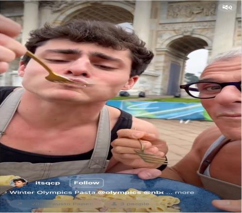 NBC邀請(qǐng)了Gianluca Conte (@itsQCP) 前往開幕式、演播室和各種活動(dòng)現(xiàn)場(chǎng),這位頗受歡迎的網(wǎng)紅將視頻發(fā)布到他的Instagram故事中,與他的340萬粉絲分享。他以烹飪內(nèi)容聞名,這次還發(fā)布了一段與一位意大利廚師合作的視頻,他們用奧運(yùn)五環(huán)意面制作了一道菜肴,并在和平拱門前的奧運(yùn)圣火旁享用了這道菜?!斑@比他寫‘這是我在米蘭-科爾蒂納冬奧會(huì)的每日博客’要真實(shí)得多。”Karapetyan說。