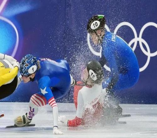那是女子1500米四分之一決賽,短道速滑本來就險,選手貼著冰面飛。快到終點時,美國選手桑托斯-格里斯沃爾德一個動作引發連環撞,包括意大利名將豐塔納在內的好幾個人摔成一團。