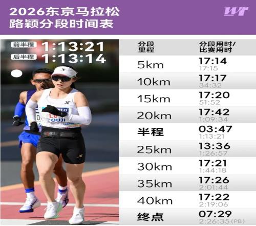 七位中國女精英出戰東京,來自河南隊的路穎如愿PB,也是此次東馬完賽最快的中國女選手。2:26:35——這是路穎交出的大滿貫首秀成績單。比之2025年無錫馬拉松跑出的2:27:30快了55秒。這55秒的進步,是路穎用前半程1:13:21后半程1:13:14的負配速跑出來的。她說,自己東京之行的一大收獲就是跑出一場“負配速”比賽,這在自己過去的比賽中很少經歷。
