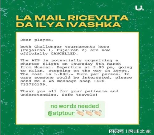就在所有人都在期待ATP的表態,以及這件事的最終走向時,球員伊利亞·伊瓦什卡通過個人社交媒體第一時間對外透露,所有球員的抗爭和外界為滯留球員的發聲贏得了全面勝利,撤離中東包機費用事件畫上了句號,結果讓所有人都很滿意。