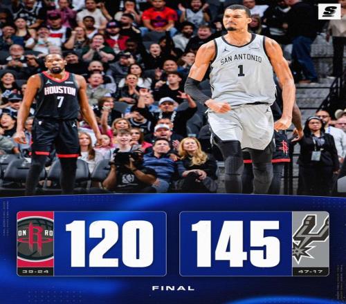 馬刺連續遠投不進,杜蘭特上籃得分,申京封蓋福克斯,福克斯命中三分球還以顏色。距離終場還剩4分13秒,火箭落后20分,烏度卡換下全部首發,選擇提前棄子認負,比賽就此失去了懸念。霍勒迪中遠距離連續不進,哈珀上籃得手,杰夫格林2罰全中,馬刺換上板凳席末端的球隊,兩隊在場上練兵,時間逐漸走完。最終,馬刺以145比120完勝火箭,就此取得了3連勝。休斯頓排名從西部第3跌至第4,被森林狼反超。數據顯示,145分也創造了火箭本賽季的單場失分紀錄,此前僅為133分。