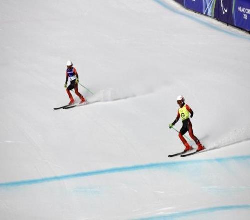 “左”“右”“壓”……中國殘奧高山滑雪領滑員陳治成通過頭盔內的藍牙耳機給殘奧高山滑雪運動員王行懂精準播報雪道情況。