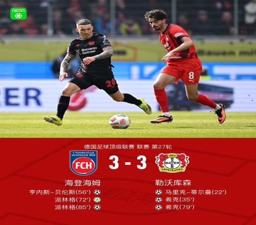 北京時間3月21日德國足球頂級聯(lián)賽 第27輪,海登海姆主場對陣勒沃庫森。上半場蒂爾曼首開記錄,隨后希克破門擴大比分,下半場貝倫斯、派林格破門扳平比分,希克頭球破門梅開二度將比分超出,派林格在角球進攻中頭球破門再度扳平比分。最終比分海登海姆 3-3 勒沃庫森。