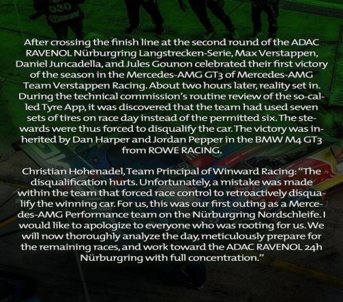 維斯塔潘在北京時間昨晚進行的第二場紐博格林超級系列賽(NLS)中與隊友一同獲得第一。但他們只高興了沒多久,賽后技術檢查發現,車隊一共使用了7套輪胎,而規則只允許6套。因此,賽事方最終取消他們的比賽成績。