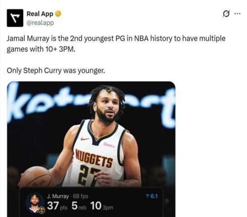 第2、數據統計顯示:穆雷(29歲38天)成為NBA歷史上多次單場投進10+三分第二年輕的球員,僅次于斯蒂芬庫里。