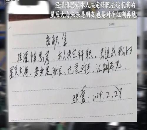 2024年3月,張雪在朋友圈官宣裸辭,“其實我還是很自私的,我只想著自己的夢想,沒有照顧投資人的收益”。同時附上一封僅33個字的辭職信,最后寫著“江湖再見”。