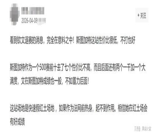 有人直言,鄭欽文退出斯圖加特如果并不是傷病,只是身體太疲憊,說明根本不會影響后面出戰馬德里、羅馬和法網。同時還調侃斯圖加特官方,用詞一點都不嚴謹,用了“傷病”來宣布鄭欽文退賽這件事,把大家嚇了一跳。