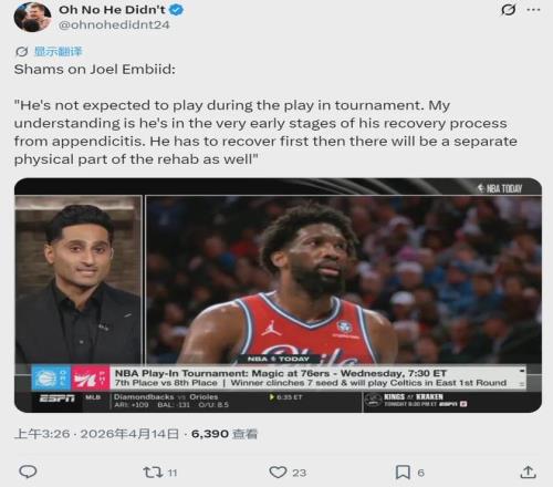 北京時間4月14日,NBA名記Shams報道,76人球星恩比德因闌尾切除手術(shù),仍在恢復(fù)階段,預(yù)計附加賽報銷。76人常規(guī)賽45勝37負排名東部第7,第一場附加賽將對陣魔術(shù)。如果76人輸?shù)舯荣悾€要跟熱火和黃蜂的勝者再打一場。