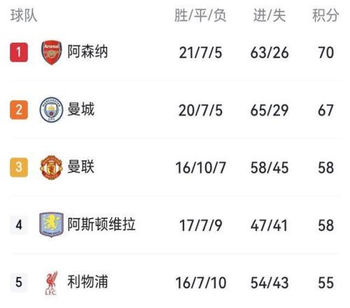 曼城在少賽1輪的情況下,32輪比賽積67分,與33輪積70分的阿森納只相差3分了,英超爭冠懸念拉滿!
